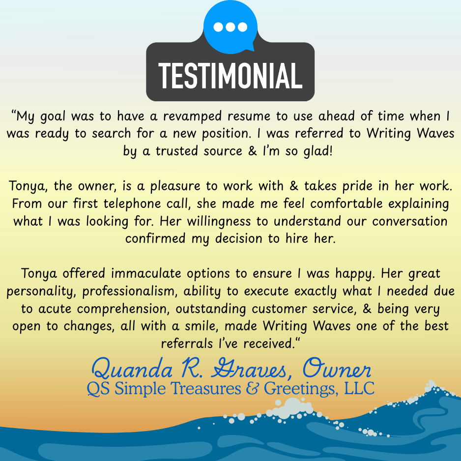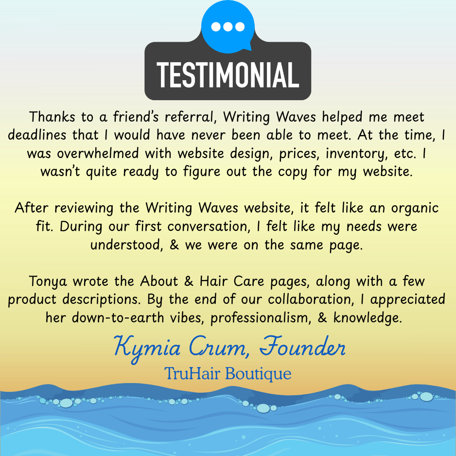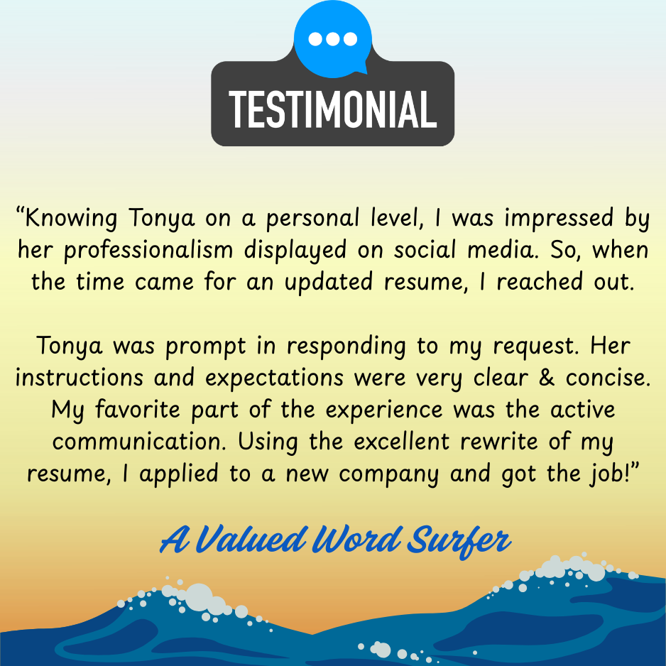I believe in full transparency. My Word Surfers’ words are 100% legit, and shared with their expressed permission. Those who chose to ride the anonymity wave carry the signature, “A Valued Word Surfer.” Rest assured, named or not, you’re getting Real Results from Real Word Surfers. 💙✍🏿🌊
